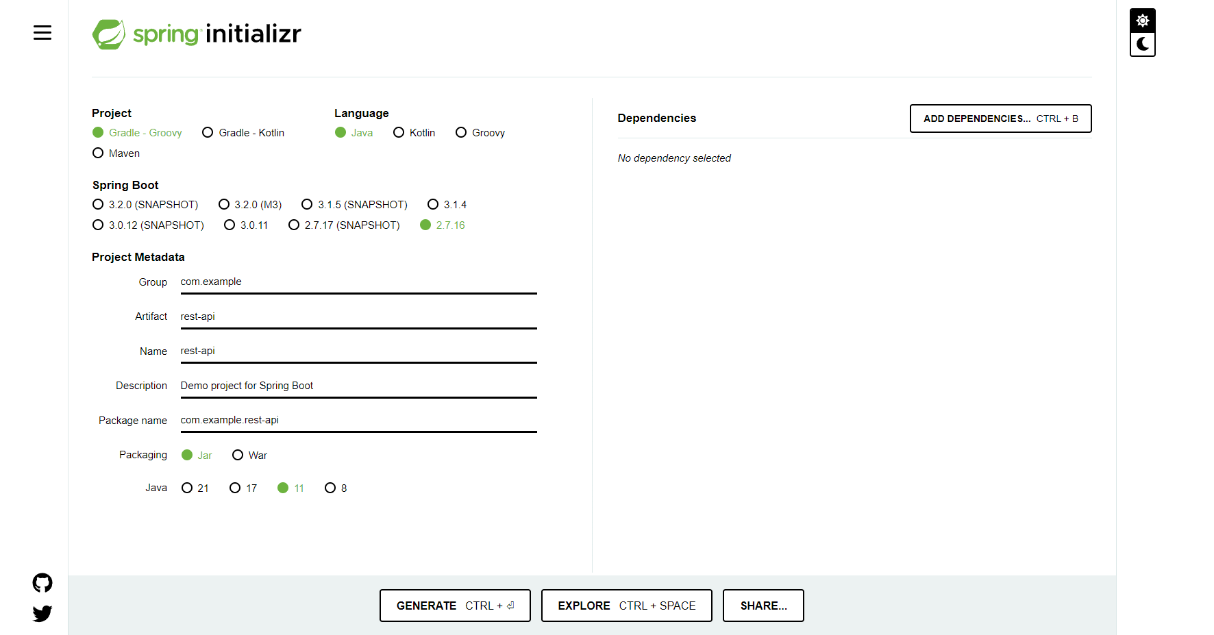 Project Metadata / Packaging - Jar - Java / 11