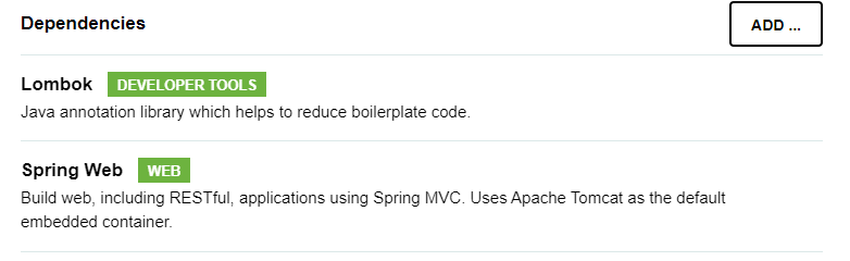 코드를 사용할때 자동완성되는 기능을 가진 [Lombok] 사용 + [Spring Web] 선택