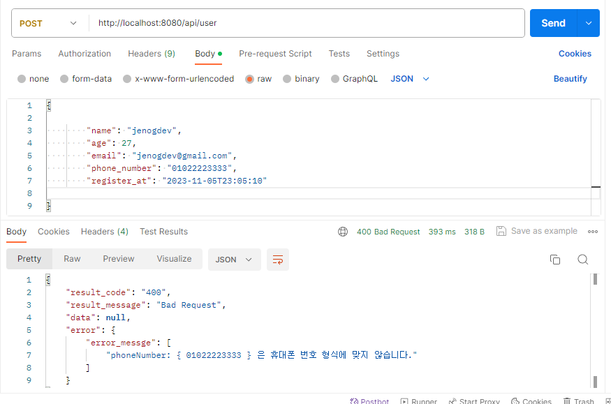 해당 vo를 선언하고 잘못된 데이터 형식을 받았을 경우를 살펴보자.