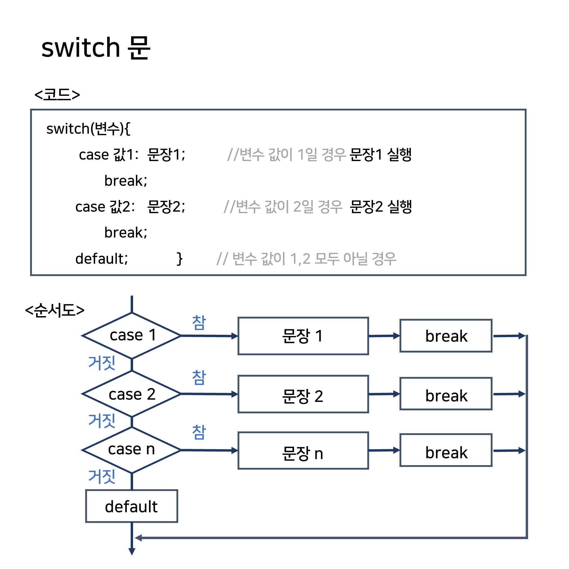 변수의 값이 case 1이라면 문장 1을 실행한 후 break문을 만나서 빠져나오는 구조를 가지고 있습니다!