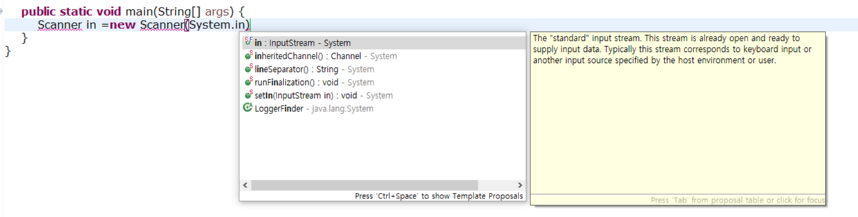 Scanner 생성 시 System.in을 딱 쳤을때에 나오는 화면입니다.