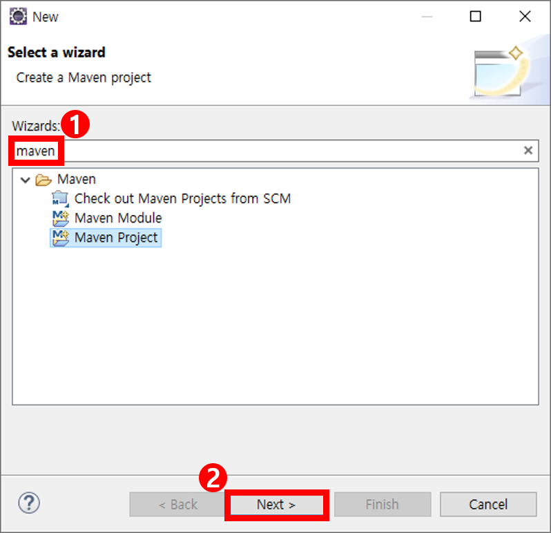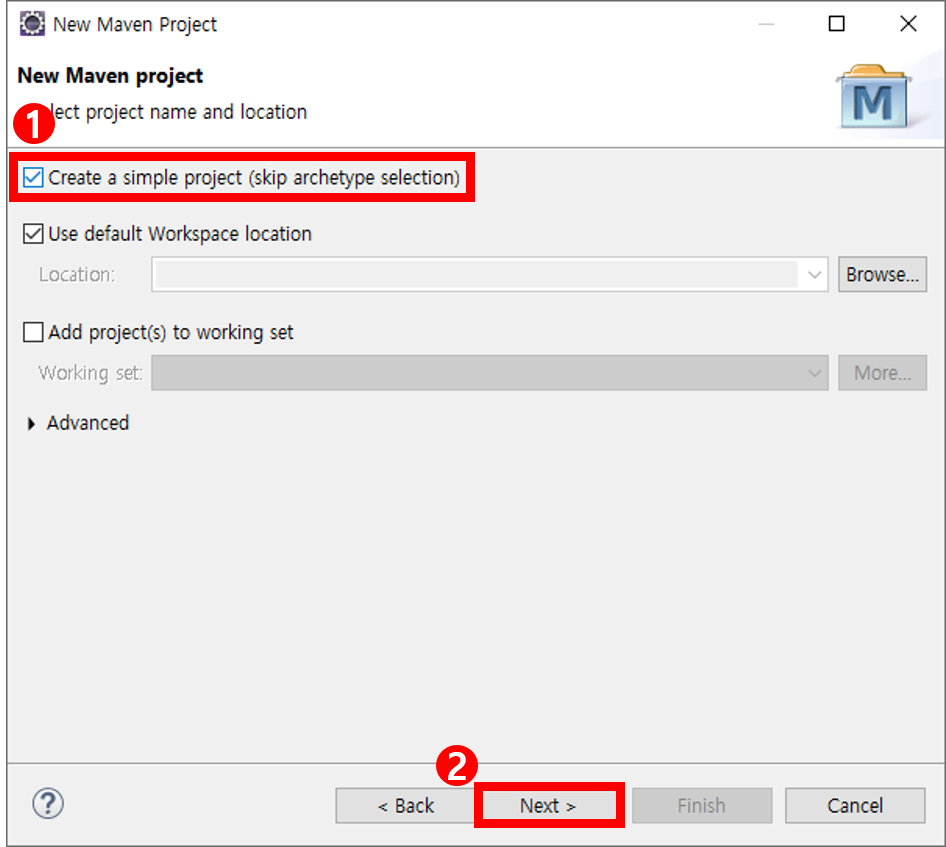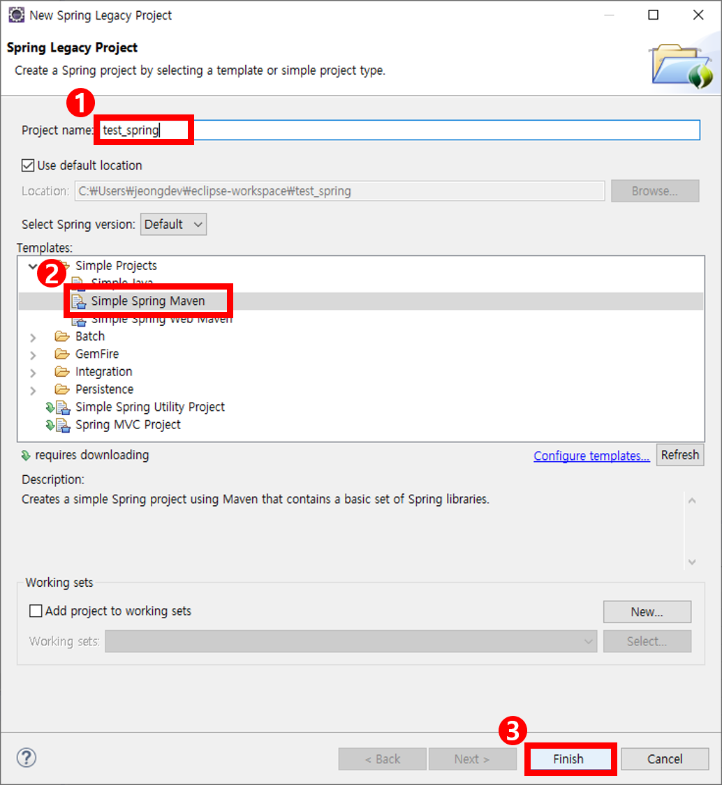 3. 프로젝트 이름 설정 후 - [Simple Spring Maven] 선택 - [Finish]