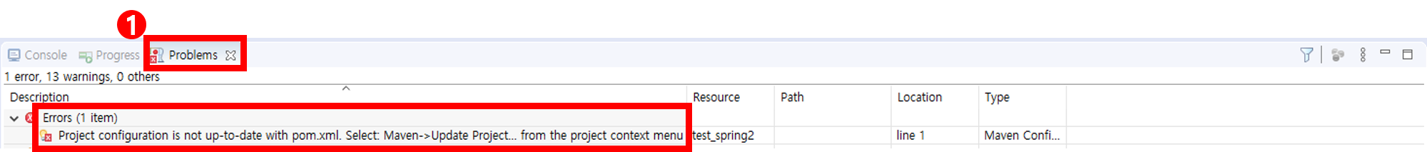 잠깐❗❗ 혹시 여기서 에러 뜨시고 계신분 있으신가요!? 아래 problems를 눌러 들어가시면 다음과 같은 에러가 뜨는 경우가 있는데요! 이 에러는 프로젝트의 JRE라이브러리 버전이 메이븐 설정파일에 명시되어 있는 버전과 일치하지 않아서 발생하는 것으로 프로젝트를 업데이트하라고 나옵니다!