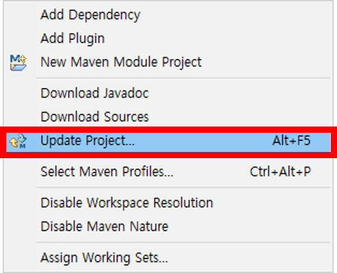 프로젝트 우클릭-[Maven] - [Updata Project..] 클릭!