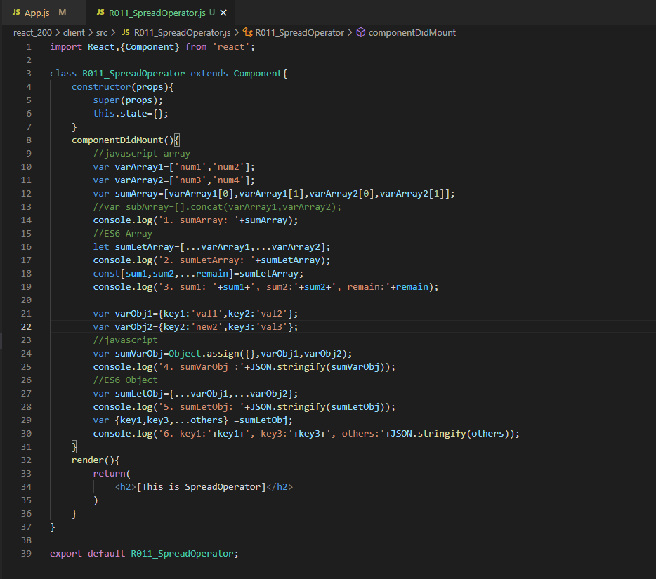 ES6에서는 전개 연산자 ...(마침표 3개)를 배열명 앞에 붙여서 여러개의 배열을 바로 합칠 수 있다.