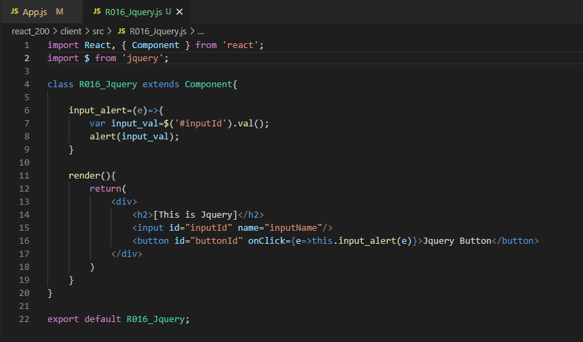 맨위에 import $ from 'jquery';라고 임포트하여 사용한다.(기호 $ 사용할것)