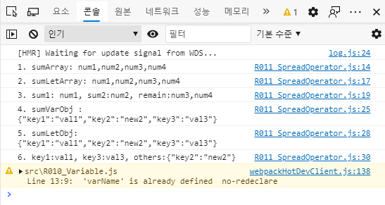 변수앞에 ...(마침표 3개)를 입력해서 사용한다.
