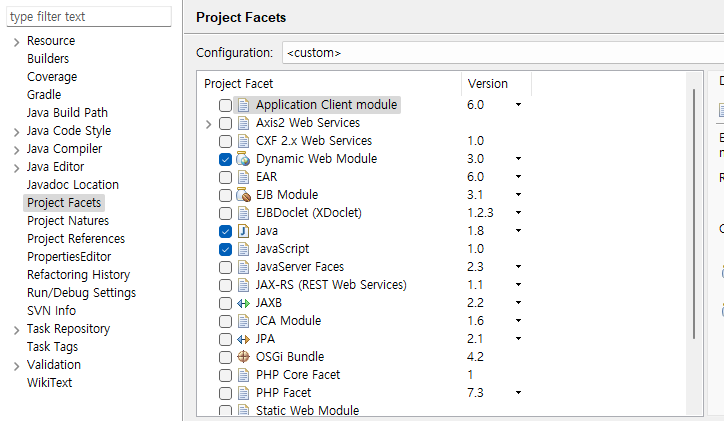 eclipse tomcat 프로젝트가 안보일때는 해당 web project > 우클릭 > Properties > Project Facets > Dynamic Web Module