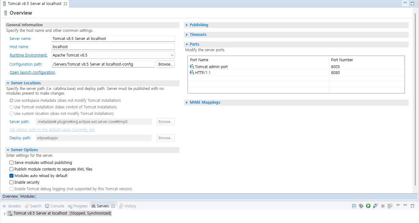 설정한 포트는 8080 , 8005임을 확인할 수 있다.