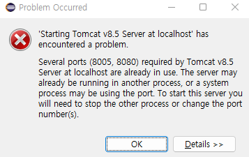 이클립스에서 사용중인 tomcat 서버포트가 사용중이라는 오류가 떠서 서버를 실행하지 못하는 경우가 생겼다.